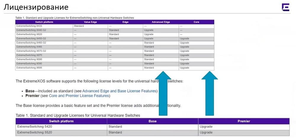Раньше были 3 варианта лицензии - Edge, Advanced Edge и Core, сейчас осталось Base и Premier. Base – это аналог Advanced Edge, а Premier – аналог Core лицензии. Если купить Premier лицензию, то она будет работать как на одной, так и на другой операционной системе, предоставляя все функции. Есть возможность в любой момент перезагрузить оборудование в любую их этих ОС и начать использовать ее, это не потребует никаких дополнительных закупок.