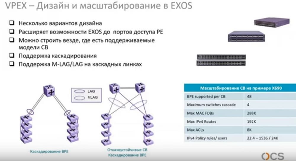 Теперь несколько слов о VPEX. Коммутаторы 5520 могут быть Control Bridges для VPEX. Это выносные коммутаторы Extreme Networks, которые в головном коммутаторе будут видеться как обычные порты. При этом можно подключать коммутаторы кольцом до 4 устройств и резервировать соединения из разных выносных линейных карт. В головном коммутаторе это будет видно как его личные порты, что весьма удобно. Однако, надо заметить, что это работает только под управлением операционной системы EXOS. В одной «железке» может быть до нескольких тысяч портов с единым местом управления.