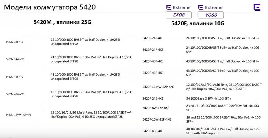 Следующая линейка коммутаторов 5420 – это средние по мощности коммутаторы доступа, в них нет возможности вставить VIM-модуль. Здесь также может использоваться одна из двух операционных систем EXOS или VOSS. Общая модель лицензирования для всей серии коммутаторов логика остается такой же. Multi-Rate 1 / 2,5 / 5 G и PoE для моделей для разных моделей составляют 30, 60 и 90 Вт. Есть также встроенные аплинки 10 G либо 25 G. Под 25 Гбит/с есть и коммутаторы ядра. Есть возможность устанавливать резервные блоки питания. Есть две модели 5430F и 5430M, последняя модель более навороченная.