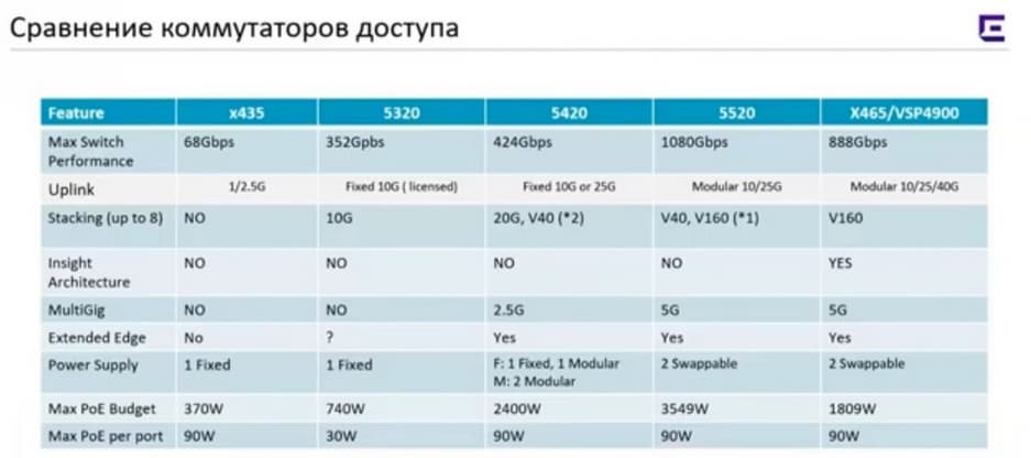 На следующем слайде представлена сравнительная таблица различных линеек коммутаторов. Самые простые коммутаторы х435 не могут работать с фабрикой как полноценные устройства.