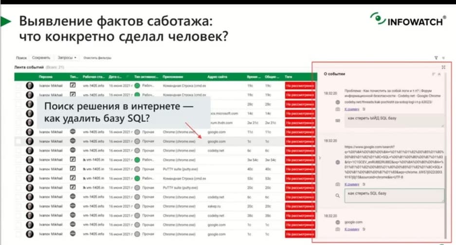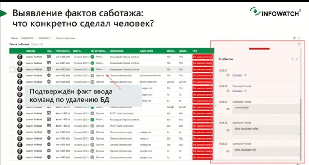 Цифр и текста может быть недостаточно, но есть скриншоты, их тоже собирают и показывают. Но факты, связанные с безопасностью, здесь уже речь не про утечку информации, а именно про порчу информации или информационных активов. Когда сотрудник обижается на организацию, то прежде, чем уволиться, он зачастую решает подтереть базу SQL с которой работают в организации. Он сначала ищет зловредные команды, как эту базу стереть.