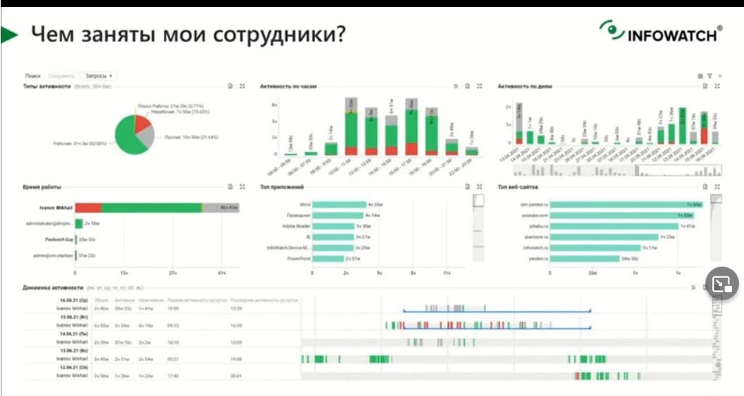 У InfoWatch есть решения класса Employee Monitoring. Оно зачастую выходит на первый план, когда речь идет о том, чем заняты сотрудники, какой характер носит их активность. Этот программный продукт по полочкам разложит руководителю то, чем занят его сотрудник за отчетный период: неделю, месяц, квартал, год. В конечном итоге вы получите статистику о том, что 70% времени ваш сотрудник или ваше подразделение, или ваша компания в целом занимались рабочими обязанностями и остальное время будет раскидано на какую-то нерабочую, возможно даже подозрительную активность.