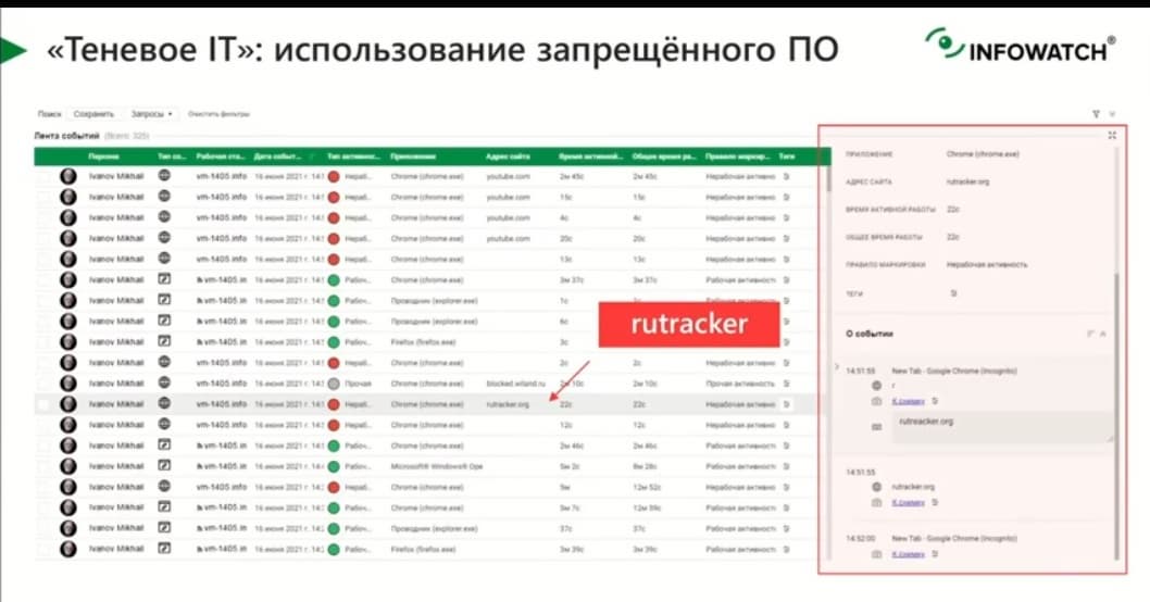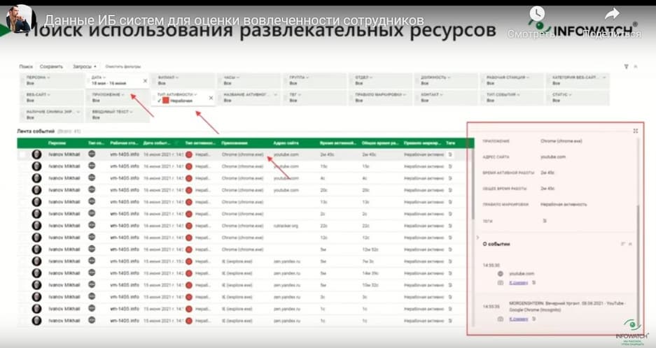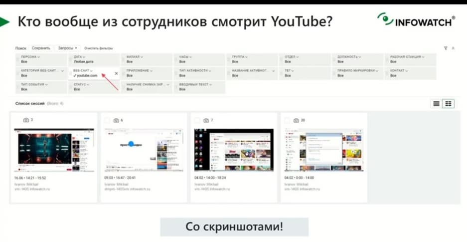 Это можно сделать либо по типу активности, либо по конкретному ресурсу. И наглядно показать, что это не просто ресурс, на котором якобы сотрудник обучался тому, как сделать работу лучше, а это на самом деле YouTube со скриншотами, которые раскрывают чем занимался сотрудник. Это потрясающе работает в рамках профилактической работы с сотрудниками, когда наглядно видно, чем занимался сотрудник на своей рабочей станции.