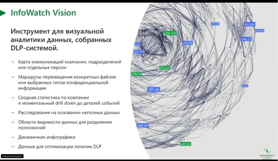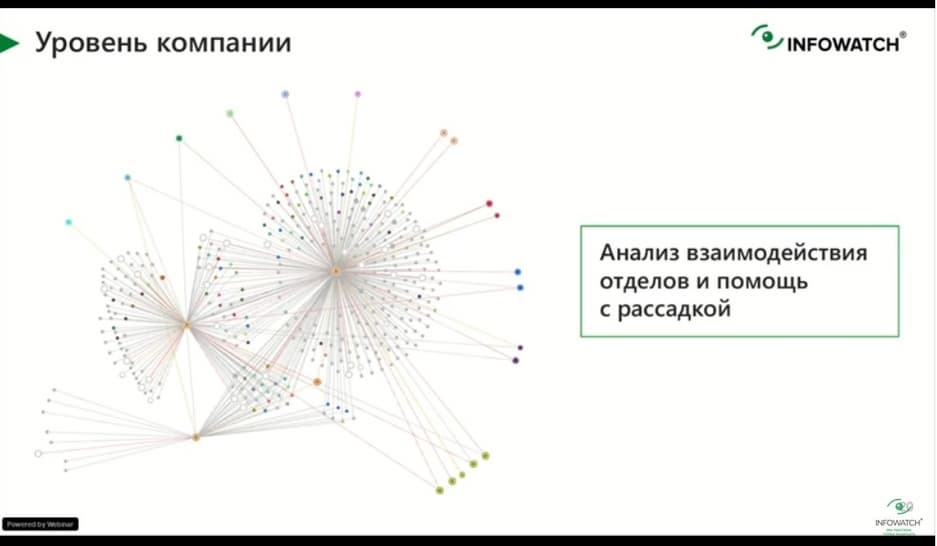 InfoWatch Vision сегодня оброс несколько бОльшими возможностями, чем просто работа с инцидентами и их расследованиями. Сегодня такой инструмент позволяет оценивать коммуникации сотрудников внутри организации, отслеживать их в динамике. Мы можем посмотреть, как коммуникация отделов выглядела раньше, например, до пандемии и ухода на удаленку, и как она выглядит сейчас. Коммуникации изменились. Есть ли коммуникации с внешними контрагентами, которых не должно быть? Есть ли коммуникации с уволенными сотрудниками, через какие каналы она происходит и в какой характер она окрашена?