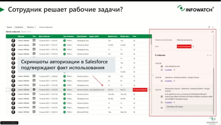 Следующий момент, на который надо обратить внимание, и который помогаем показать конкретные события. Статистика - это одно, но она вся строится на конкретных событиях. Мы в системе под событиями подразумеваем использование ресурсов, приложений, текстов, какой-то поиск. И все это можно детально показать в системе. Если вы рассматриваете 8-ми часовое событие работы, что вы конкретно там можете посмотреть: название вкладки - как правило там можно увидеть либо название организации, либо карточку клиента, с которой работает сотрудник. Вы всегда можете понять, что это действительно рабочая обязанность. И это, скорее всего, проект, который поручен сотруднику. Либо увидеть, что это не тот проект, и тогда провести беседу, и выяснить почему сотрудник работает над какими-то другими проектами.