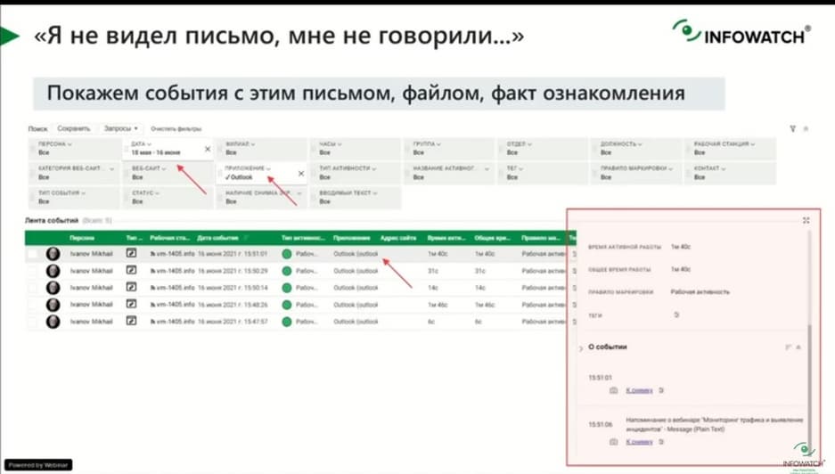Опять же в условиях, когда назначение задач происходит через автоматизированные системы и удаленно, за этим нужно следить. Одно дело, если эта задача ставится перед сотрудником вживую, другое дело, когда эта задача делегируется по удаленке, по почте. Тут всегда можно получить обратную связь. И ситуация, когда сотрудник говорит, что не был ознакомлен с письмом, никаких писем не получал, не открывал. Они тоже могут быть видны в системе Employee Monitoring. Мы, в частности, показываем события приложения Outlook. У сотрудника конкретное письмо с конкретной темой, видно что он открывал его 2 минуты, читал его и ознакомлен с ним. Поиск в том числе по теме письма возможен в системе. Я думаю. что это достаточно быстро работает и помогает делать подобного рода проверки.
