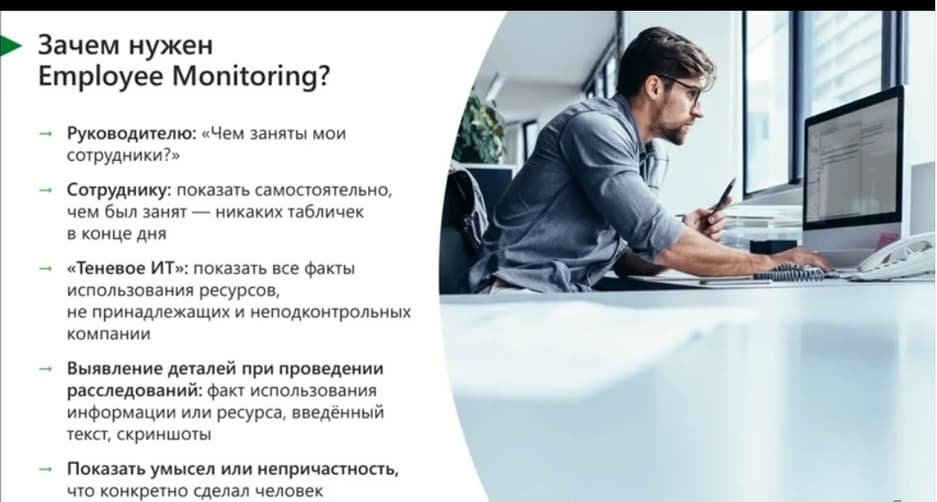 - Мониторинг того, что раньше оставалось «за кадром» - теневое ИТ, несанкционированный доступ, выявление саботажа и проработка старого доброго аргумента «я не знал, мне не говорили».
