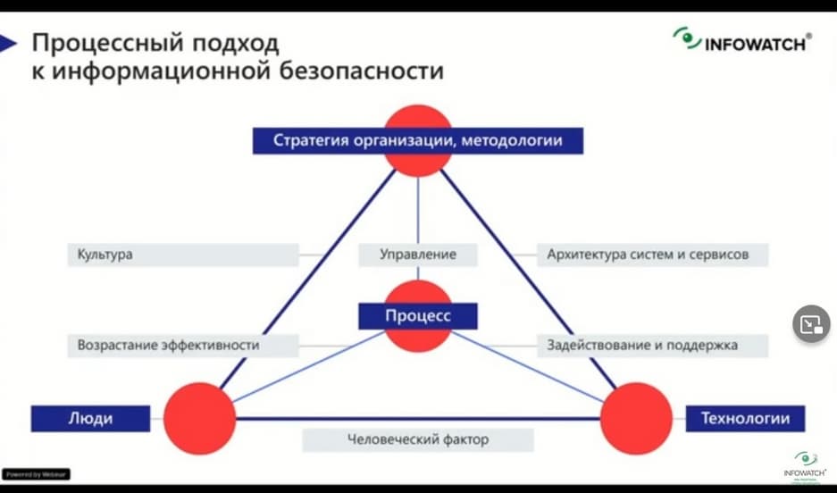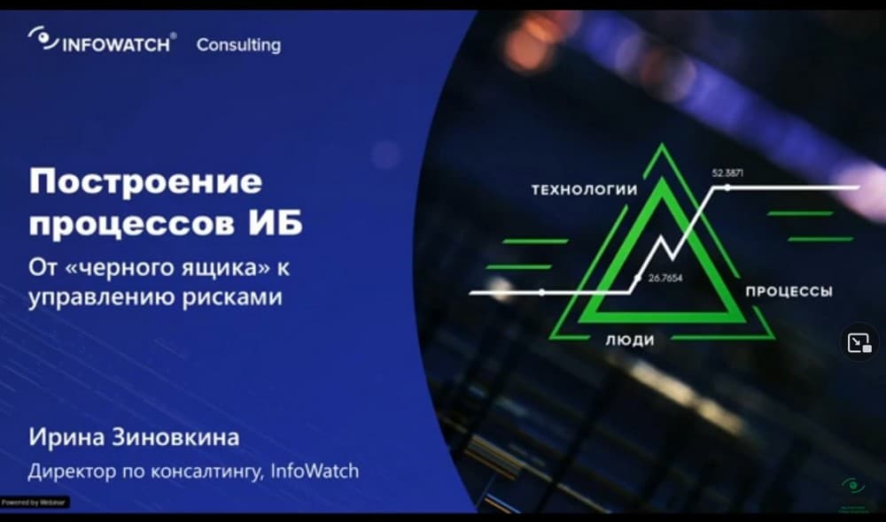 Сегодняшнее мероприятие ведет Ирина Зиновкина, директор по консалтингу компании InfoWatch. Она расскажет какие процессы нужно выстроить, чтобы построить корректную систему обеспечения защиты от утечек. При этом необходим процессный подход к ИБ.