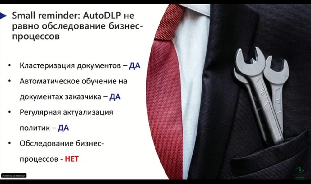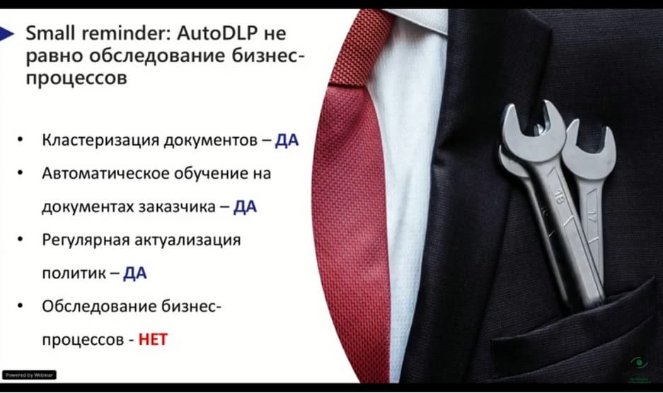 AutoDLP не идентично обследованию бизнес-процессов. Потому что модуль AutoDLP умеет много полезных вещей таких, как кластеризация документов, он умеет обучаться на документах заказчиков, он помогает регулярно актуализировать политики. Но при этом он не может заменить обследование бизнес-процессов. Он не понимает такие атрибуты, что и в какой период времени и куда должно передаваться. Потому что часто бывает, что какой-то документ, например, передается в строго определенное время, допустим, один раз в квартал, а все, что выходит за эти сроки - это уже инциденты ИБ. Именно поэтому AutoDLP является тут хорошим помощником в этом обследовании, хорошим инструментом для настройки политик, но заместить полноценно данное обследование бизнес-процессов он не сможет.