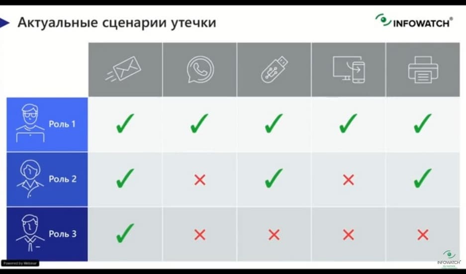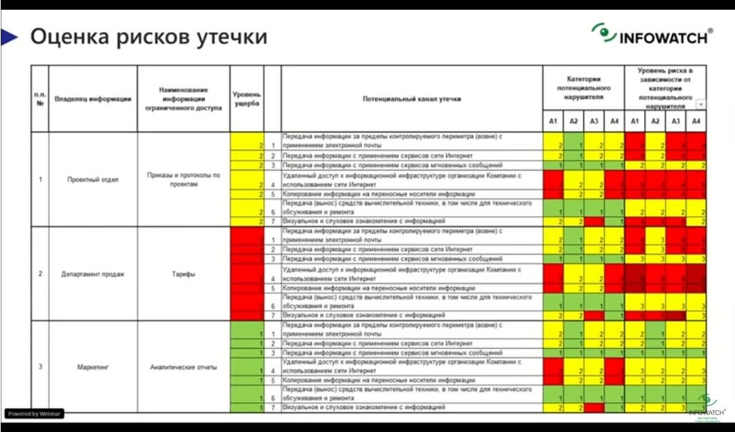 Актуальная сценарии утечки находятся полностью на стороне ИБ и ИТ. Здесь нужно оценить какие нарушители к данным каналам имеют доступ и какие меры защиты к каждому каналу применены, какова вероятность утечки. На выходе получаем матрицу рисков.
