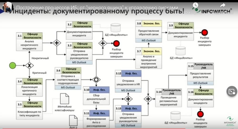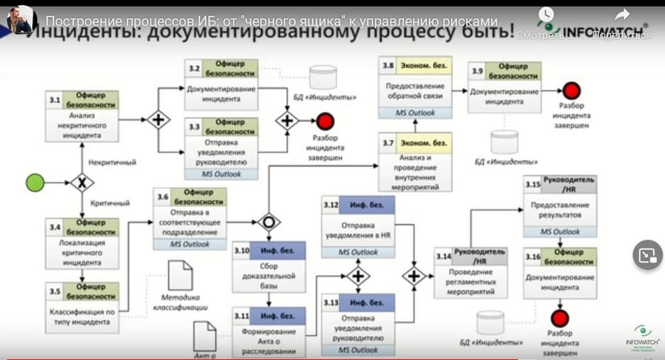 Регламенты и расследование инцидентов, но тот путь, по которому идет инцидент, связанный с утечками, он немного другой, нежели инциденты с ИБ. Поэтому его стоит документировать, поскольку у нас всегда есть некие обязательства, в том числе судебные. Мы должны оперативно расследовать инциденты, при этом всё должно быть правильно оформлено. Суд в первую очередь смотрит, как у вас оформлено служебное расследование, есть ли все документы, подписи, в какой срок вы запросили объяснительны записки. Правильно должны быть разграничены права между подразделениями, чтобы каждое отвечало за свою сферу деятельности, когда речь идет об утечках, то в процессе участвуют не только сотрудники ИБ-подразделения, но и кадры, а также экономическая и внутренняя безопасность, юристы и другие службы.