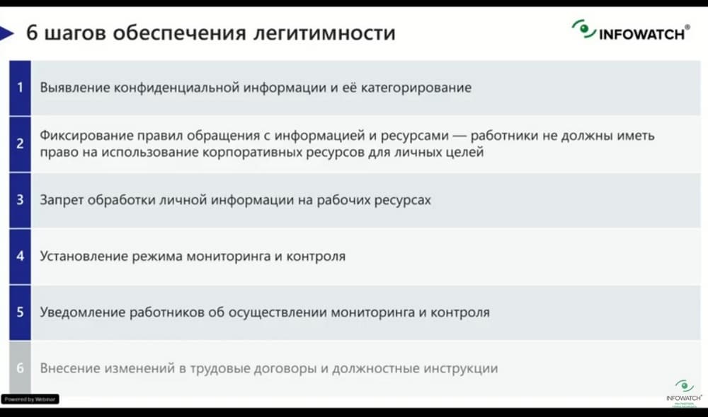 Чтобы обеспечить легитимность, так же следует запретить отработку личной информации на рабочих ресурсах. Если вы это официально не запретите, то и мониторинг становится не совсем законным. Если сотрудник на свой страх и риск продолжает такую обработку, то совет – не на всякий случай использовать подобные инциденты в судах.