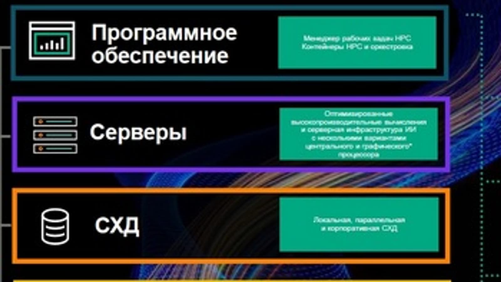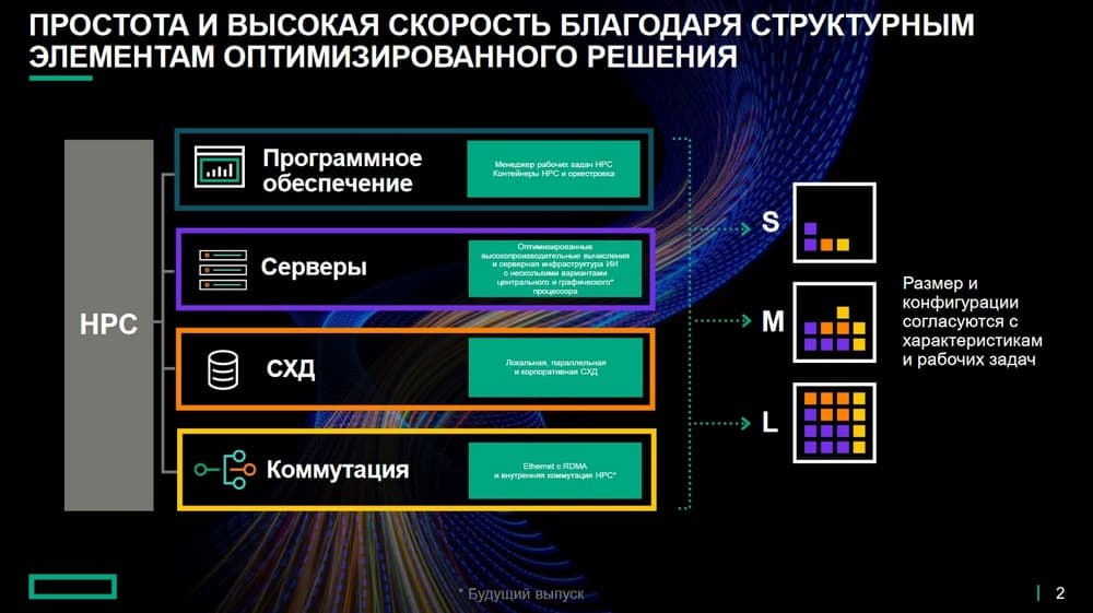 Начнем с качественной коммутации, ведь вычисления HPC связаны с кластерными вычислительными системами и у нас есть для этого все необходимое. В комплект также входит высокопроизводительная СХД, так как обычно в системах HPC генерируются большие объемы данных, которые нужно быстро определить на хранение. В других сценариях, больше связанных с ИИ/МО, также выполняется загрузка и обработка больших объемов данных, поэтому в рамках решения HPC, мы предлагаем высокопроизводительные СХД. Последними двумя компонентами будут высокопроизводительные серверы с разными вариантами графических и центральных процессоров и ПО, которое устанавливается поверх всего этого для удобства управления и учета потребления. Затем добавляется специализированное ПО HPE для развертывания рабочих задач. Здесь для простоты мы применяем особый подход, когда заказчику достаточно просто заявить, что ему нужны вычисления HPC и получив ответы на ряд вопросов, мы определим требуется ли ему решения малого (S), среднего (M) или большого (L) размера.