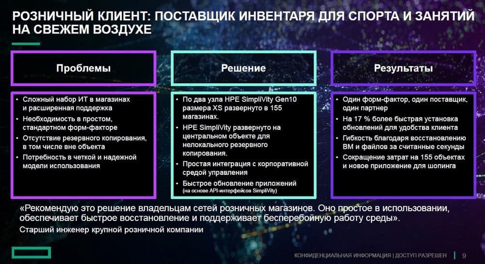 Увеличили скорость установки обновлений на 17%, что повысило удобство и сократило расходы. Вот цитата заказчика: "Рекомендую решения HPE SimpliVity владельцам сетей розничных магазинов." С помощью архитектуры HPE SimpliVity и комплекса услуг мы помогли многим компаниям в сфере розничной торговли. Так же, как и в промышленном производстве, сельском хозяйстве и гостиничном бизнесе.