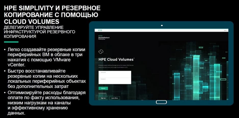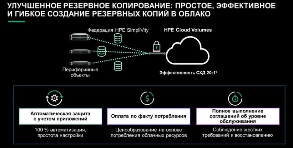 Теперь, если клиент хочет создавать резервные копии ВМ не только основного, но и периферийных объектов в общедоступном облаке, что особенно актуально для клиентов HPE SimpliVity, можно делать это напрямую в HPE Cloud Volumes. HPE SimpliVity предлагает интеллектуальную, но простую инфраструктуру.