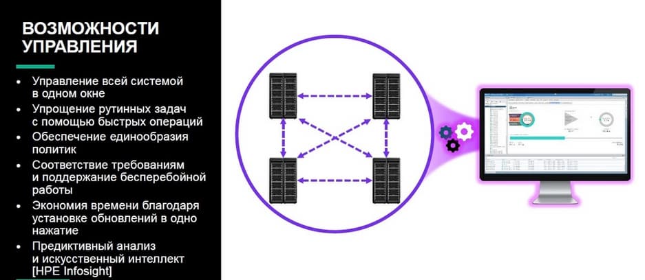 Управление - еще одна ключевая функция SimpliVity. Оно интегрировано в vCenter, что позволяет контролировать все процессы с помощью одного интерфейса. Большинство операций можно выполнять парой щелчков мышью. Для поддержки инфраструктуры можно выполнять быстрые обновления. Так, новые версии OmniStack, ESXi и микропрограммы устанавливаются автоматически и не требуют дополнительных действий. Чтобы расширить функционал SimpliVity, выполняется интеграция с HPE InfoSight. Это позволяет использовать ИИ и прогнозный анализ. Так клиенты лучше понимают, что происходит в инфраструктуре в конкретный период.