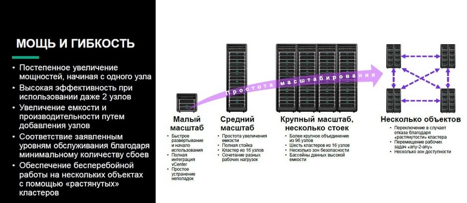Однако многим заказчикам по-прежнему приходится отправлять данные в ядро сети. SimpliVity позволяет снизить затраты примерно на 90%, т.е. гарантируя повышение эффективности в 10 раз. Для этого недостаточно управлять архитектурой ЦОД. Для отправки данных заказчики используют WAN-соединения, что влечет за собой огромные расходы на WAN. Преимущество SimpliVity заключается в том, что вы можете начать с малого и на этом остановиться. У нас были клиенты, которые перестраивали ЦОД, сокращая несколько стоек до пары узлов SimpliVity. Мы даем возможность клиентам начать с малого объема ресурсов. Т.е. они могут установить лишь один узел в ЦОД или на периферийном объекте, но мы рекомендуем взять два узла для высокой доступности и на резервного копирования на удаленных объектах. И, если потом им понадобится масштабировать инфраструктуру, можно будет просто добавить несколько узлов SimpliVity. Причем, во время установки новых узлов, производительность не снижается. Она наоборот, постепенно повышается, и при этом не происходит перебоев в работе системы. При масштабировании мы можем задействовать несколько стоек или, если клиент хочет иметь "растянутый" кластер, можем создать и его.