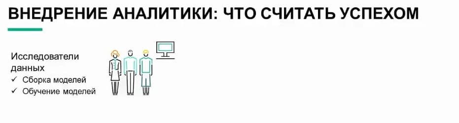 Итак, они вовлекаются в процесс проектирования на ранних этапах и работают как виртуальная команда. И наконец, последнее ключевое действующее лицо в этом процессе. Здесь еще много участников, но я рассказываю об основных. Речь идет об аналитиках, их часто называют специалистами по бизнес-аналитике или бизнес-аналитиками. Они отвечают за создание отчетов для различных направлений бизнеса. Эта должность уже существует в организациях. В контексте промышленного внедрения я рекомендую подключать их к процессу чтобы они могли формировать основные показатели производительности, панели мониторинга и предупреждения для аналитических моделей, развернутых в производственной среде. Это важно, потому что аналитические модели часто взаимодействуют с объектами реального мира, потоковыми данными, решениями, принимаемыми в реальном времени, веб-аналитикой, которые со временем меняются.