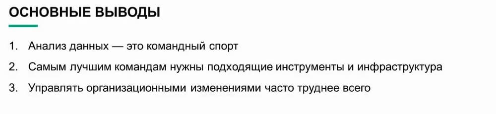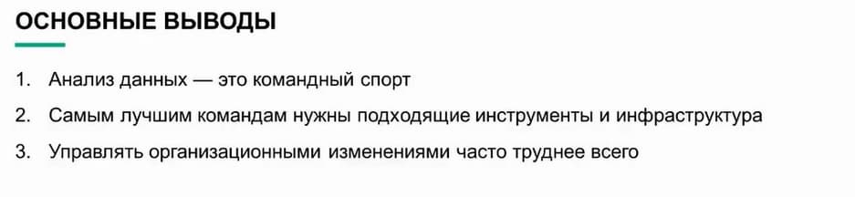 Подводя итог хочу напомнить о трех ключевых идеях. Во-первых, обработка и анализ данных – это командный спорт. У нас есть основные игроки и ключевые позиции, но это лишь отдельные функции. Только когда они все объединяются и работают для достижения общих целей, решают сложные задачи автоматизации и организационные проблемы, компания может работать эффективнее. Во-вторых, мы сможем это сделать, только располагая подходящими технологиями. У нас есть модернизированная, дифференцированная инфраструктура, например, графические процессоры, доступные этим пользователям. У нас есть ПО для максимально возможной автоматизации процесса, чтобы эти операции можно было выполнять снова и снова. Наконец нам нужно будет продумать как организация будет меняться и адаптироваться. Организационные изменения – это самая трудная часть. Подвести ее к осознанию того, что каждое решение должно приниматься на основе данных одна из основных задач промышленного внедрения.