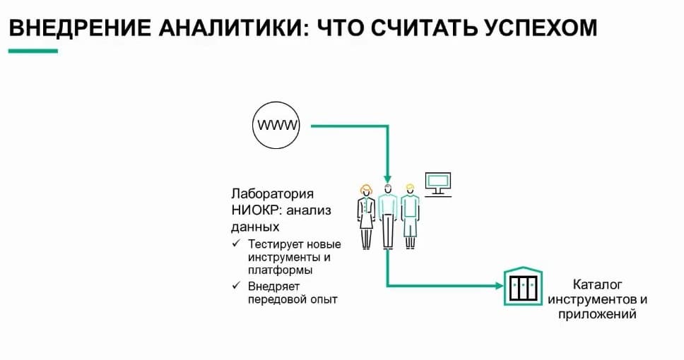 Вы подключаете поставщиков, чтобы, когда ваша команда будет готова, у вас были люди, способные собрать этот автомобиль. То же справедливо и для промышленного внедрения анализа данных. Нам нужно, чтобы логистическая цепочка, поток данных были готовы для выполнения аналитических моделей. Они должны быть предусмотрены и доступны для всех аналитических задач организации. Нужны подходящие инструменты - не только во время экспериментов. Специалистов, которые создают аналитические модели, должны иметь доступ к новейшим инструментам и инфраструктуре, будь то ЦП, ГП или области верхней памяти - все это также должно доступно. И самое важное: эту сборочную линию нужно настроить, чтобы она позволяла развертывать аналитические модели в производственной среде. Это значит, что производственная среда должна быть готова к использованию инструментов, библиотек, наборов данных и приложений, разработанных на более ранних этапах процесса. Во многих организациях направление R&D воспринимается как центр передового опыта, в котором специалисты по данным и инженеры объединяют усилия для поиска решений и взаимодействуют с IT-отделами для подготовки процесса к внедрению. Далее специалисты по данным отбирают новейшие инструменты и библиотеки, сертифицированные организацией. Они выбирают подходящие данные, необходимые для решения конкретной задачи как инструменты в строительном магазине, а затем проводят эксперименты. Они строят эти аналитические модели. Они обучают эти аналитические модели. Причем все это они делают итерациями снова и снова. Обычно не в изоляции от других. Часто несколько специалистов по данным работаю вместе, сотрудничают на проектах - на уровне организации, подразделения или даже отдела.