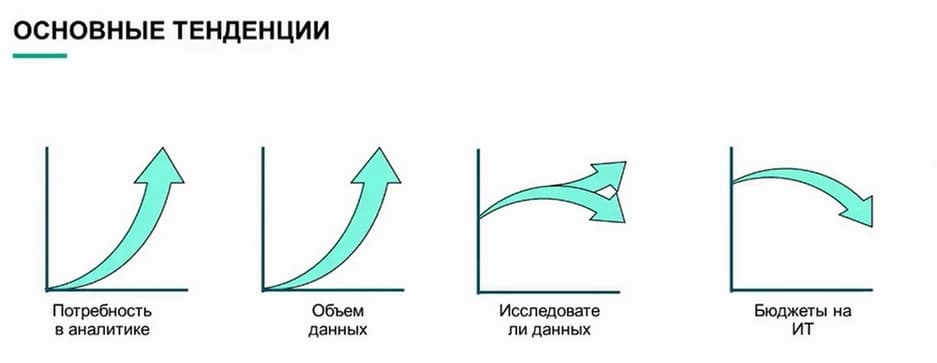 Какие тенденции наблюдаются в организациях. Во-первых, растущая потребность в аналитике. Компаниям необходимы более эффективные отчеты о прошедших событиях, анализы тенденций, исследование данных. Спрос на аналитику увеличивается в геометрической прогрессии в соответствии с растущим объемом данных. Появляются новые приложения, инфраструктура, точки взаимодействия с клиентами, и все они порождают данные, которые организациям нужно обработать и использовать. Эти задачи выполняют специалисты по анализу и обработке данных. Зачастую организациям непросто нанять или удержать их. Это также одно из условий рассматриваемой задачи промышленного внедрения. Также не будем забывать, что эта статья часто не учитывается в IT-бюджетах организаций.