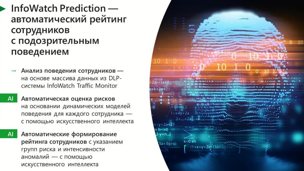 Теперь несколько слов об InfoWatch Prediction. Эта система позволяет выявлять аномальное поведение, выявлять девиации в поведении сотрудников на рабочих местах и соотносить с каким-нибудь риском, может сотрудник собирается уволиться, либо незаконно вывести информацию, а пока сотрудник аккумулирует информацию либо потихоньку выводит ее из компании.