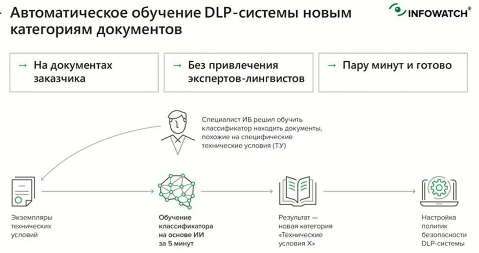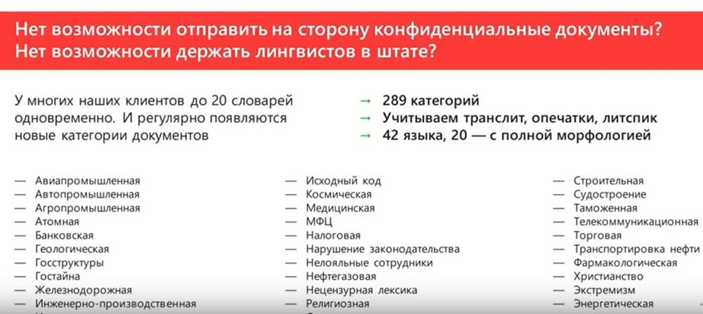 У InfoWatch есть технология, заменяющая человека, ей «скармливаешь» первичные документы, она через минуту выдает готовый лингвистический словарь. Эту технологию мы долго тестировали, мы сравнивали эту технологию с работой живого человека. Эта технология в отдельных случаях по качеству превосходила человека. Было проведено много полевых тестирований. Продукт был готов, но тестирование у нас заняло 2 года. Когда мы убедились, что данная технология хорошо работает, только тогда мы предоставили ее рынку.