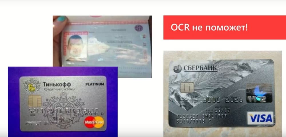 На выше представленном слайде приведены примеры кредитных карт, в нижнем правом углу можно прочитать номер карты. Многие вендоры говорят, что не нужно машинное зрение, OCR может распознать эти карты. После реальной проверки ни одна программа OCR не распознала номера на этих кредитных картах. На том же слайде пример фото паспорта, если бы это был скан паспорта, то OCR скорее всего справился с распознаванием, но здесь ломинированный документ с бликами, с такой задачей OCR не справляется. Технология машинного зрения справляется с такой задачей.