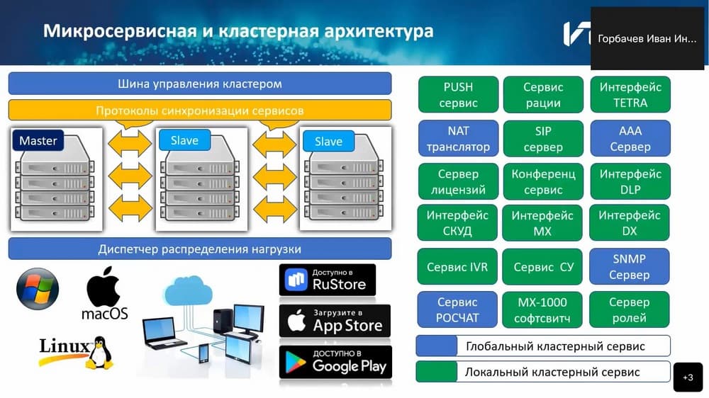 Теперь несколько слов о структуре мессенджера. Используется кластерная архитектура, неограниченное количество резервирующих серверов, каждый сервер имеет глобальные и локальные кластерные сервисы. При падении локальных сервисов, эти сервисы поднимаются на следующей машине, т.е. основной сервер продолжает работу, не падает и не переходит в перезагрузку. Если падает глобальный какой-то сервис, тогда следующий по списку сервер становится мастер-сервером. Приложения доступны в интернет магазинах, все приложения обновляются, новые релизы выходят практически каждый месяц. При обновлении серверов нами высылается специальное письмо.