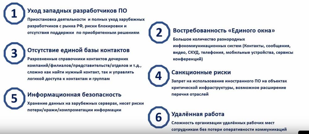 Заказчику важно получить решение из единого окна, в которое должны поместиться справочники контактов, сообщения, видеосервисы, системы контроля уровнем доступа, телефония и другие информационные системы и сервисы. Во многих компаниях отсутствует единая база контактов, дозвониться до специалиста из соседнего филиала бывает трудно, а зачастую и невозможно, преобладают санкционные риски, есть запрет использования иностранного ПО на объектах критической инфраструктуры. Такой запрет может быть введен и на других важных объектах. Хранение данных на зарубежных серверах несет риски их потери или кражи. Удаленная работа актуальна до сих пор, даже после пандемийного периода, где-то используется гибридная форма, поэтому важно обеспечивать мобильность своих сотрудников.