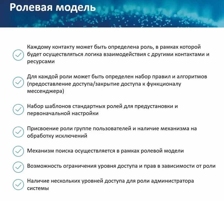 РОСЧАТ – находится в реестре Минцифры, у решения есть продвинутая ролевая модель для взаимодействия пользователей. Каждому контакту или его группе может быть отведена определенная роль, в рамках которой будет определяться логика взаимодействия с другими контактами и ресурсами.