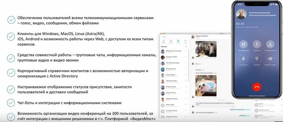 Что касается мессенджера, то в нем есть стандартные сервисы, которые есть в публичных приложениях, таких как Telegram и WhatsApp, это обеспечение базовым голосом, видео, отправка сообщений, обмен файлами, есть групповые аудио и видеозвонки, есть средства совместной работы, т.е. групповые чаты, информационные каналы открытые и закрытые по типу Telegram, где администратор публикует новости, а пользователи их могут только читать, комментировать и ставить лайки. Есть функционал чат-бота, для получения выписок сотрудникам для регистрации заявки на получение денежных пособий, отпусков и т.д.