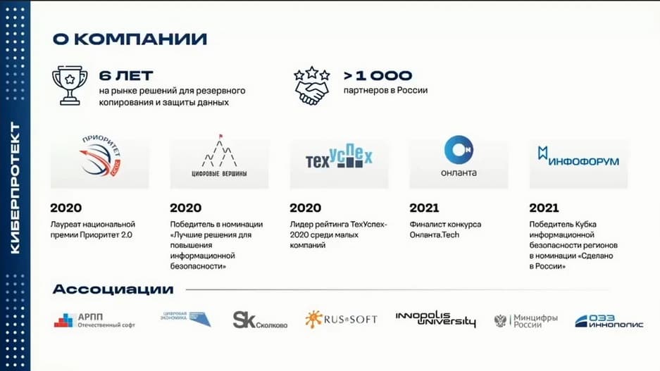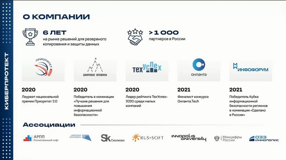 Компания «Киберпротект» была образована в 2016 году, сейчас у компании более 1200 партнеров в России и в Беларуси, несколько тысяч сделок по продаже систем резервного копирования КИБЕР Бэкап было совершено в 2022 году.