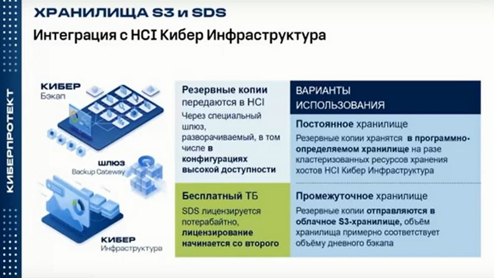 Кибер инфраструктура может хранить копии локально или перекладывать резервные копии во внешнее облако, благодаря шлюзу Backup Gateway, изображенному на слайде.
