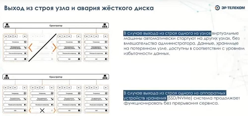 Для защиты данных используется механизм тройной репликации, каждый блок данных записывается на три произвольных узла. В этом случае, даже если упадут два сервера, данные останутся доступными и виртуальные машины будут функционировать. Для оркестрации выпускается отдельный сервисный контейнер, в котором есть интерфейс управления. Внутри самого сервер-контейнера с оркестратором нет никаких служебных данных. Они хранятся тем же методом, что хранятся пользовательские данные на распределенных хранилищах. В этом случае, в случае выхода из строя любого из узлов, сервисный контейнер может быть перезапущен на абсолютно любом узле и функциональность среды управления будет восстановлена в кратчайшие сроки. За счет того, что система является горизонтально масштабируемой, можно как добавлять узлы, так и исключать их из состава кластера. Это позволяет добиться определенного рода легкой масштабируемости и расти по мере возникновения потребности в этом. Поэтому минимально рекомендуемой конфигурацией является конфигурация в четыре узла. Далее из нее можно будет вырасти в большую инсталляцию.
