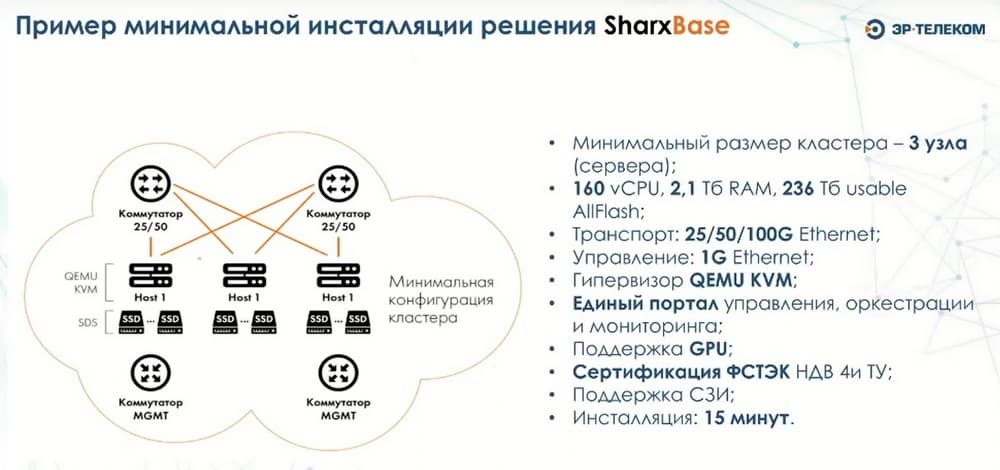 Это пример минимальной инсталляции. У нас конфигурация должна включать в себя три узла, три сервера. В этом случае в зависимости от аппаратной конфигурации можем получить до 160 vCPU и 2,1 Тбайт RAM и 236 Тбайта доступного дискового пространства.