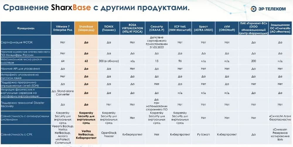 На следующем слайде приведено сравнение ПО компании с конкурирующими продуктами и характеристики SharxBase.