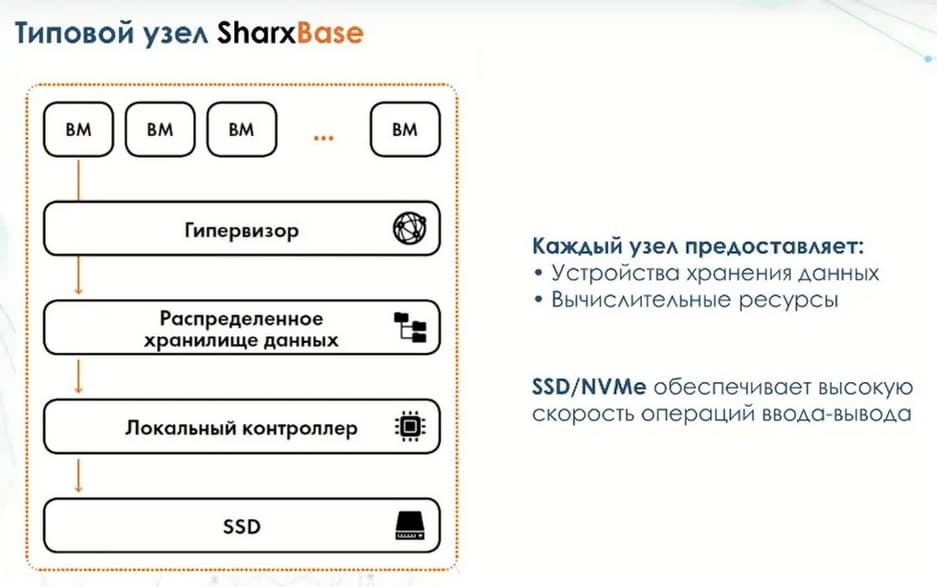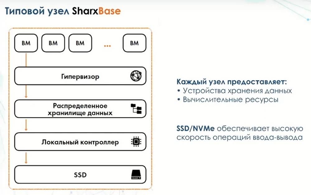 SharxBase – это платформа виртуализации, гиперконвергентное решение, которое объединяет в себе виртуализацию как вычислительных ресурсов, так и ресурсов хранения. За счет архитектурных особенностей система не имеет единой точки отказа и предназначена для создания различных инфраструктур, которые должны обеспечивать высокодоступное решение для запуска различного рода ИС.