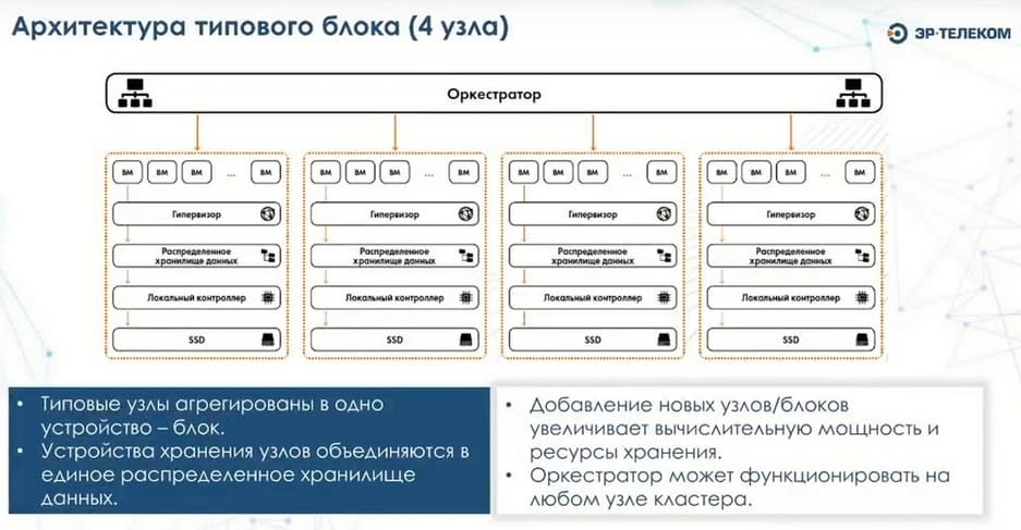 На слайде приведены отличительные особенности системы. Одним из основных кейсов является решение по созданию инфраструктуры виртуализации, которые позволят создавать виртуальные ЦОДы и виртуальные платформы. За счет того, что система построена на базе современного оборудования с использованием SSD-накопителей – данная архитектура позволяет обеспечивать функциональные возможности для запуска различных кластеров аналитики и высоконагруженных баз данных.