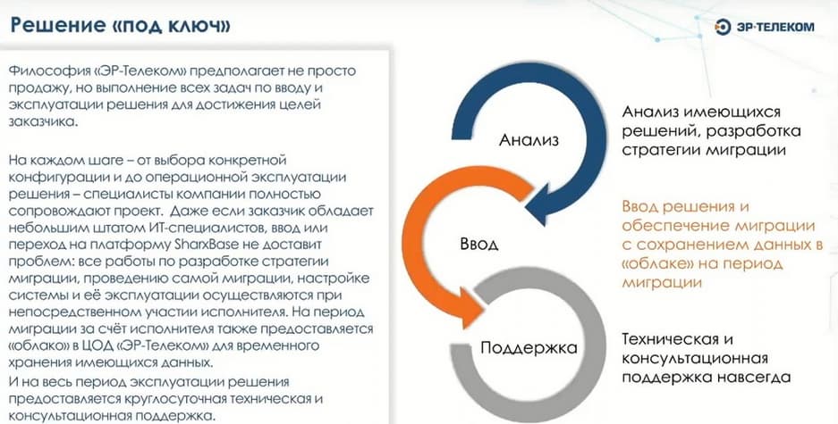 Мы с помощью нашего ПО и ПАКов, выпускаемых на базе ПО компании «Шаркс Датацентр», предлагаем решение под ключ, готовы оказывать консультационные услуги по проектированию инфраструктуры и помогать в имплементации этих решений. Помогаем мы и по процедурам инсталляции, это входит в базовый пакет, мы можем произвести у клиента инсталляцию удаленно.