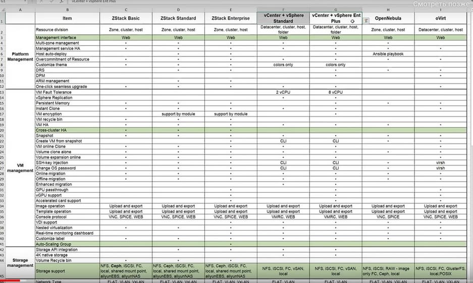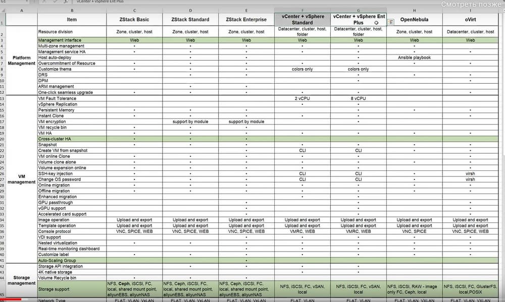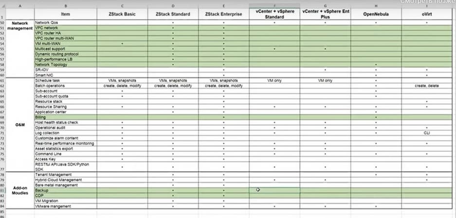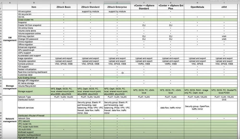 - Сравнение функционала ZStack с популярными отечественными платформами OpenNebula и Ovirt.