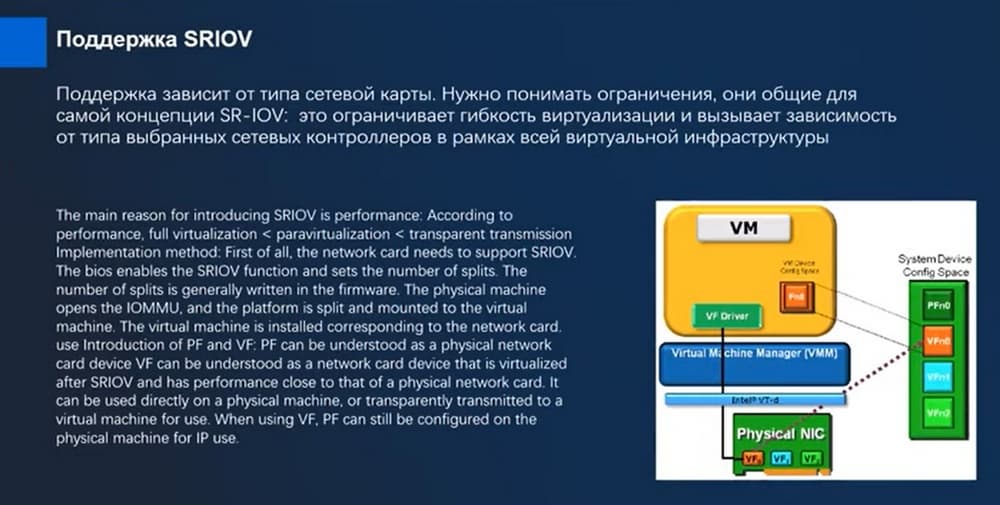 Поддержка SRIOV (Single Routing Input Output Virtualization) представлена на следующем слайде.