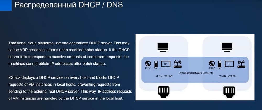 В этом случае вы не привязаны к серверу DHCP в рамках инфраструктуры, вы контролируете как администратор виртуализации все эти технологии, тем самым обеспечивая безопасное распределение IP адресов в рамках нужных вам VLAN и также можно реализовать DNS, обеспечивая полноценный контроль за распределением миллионов адресов.