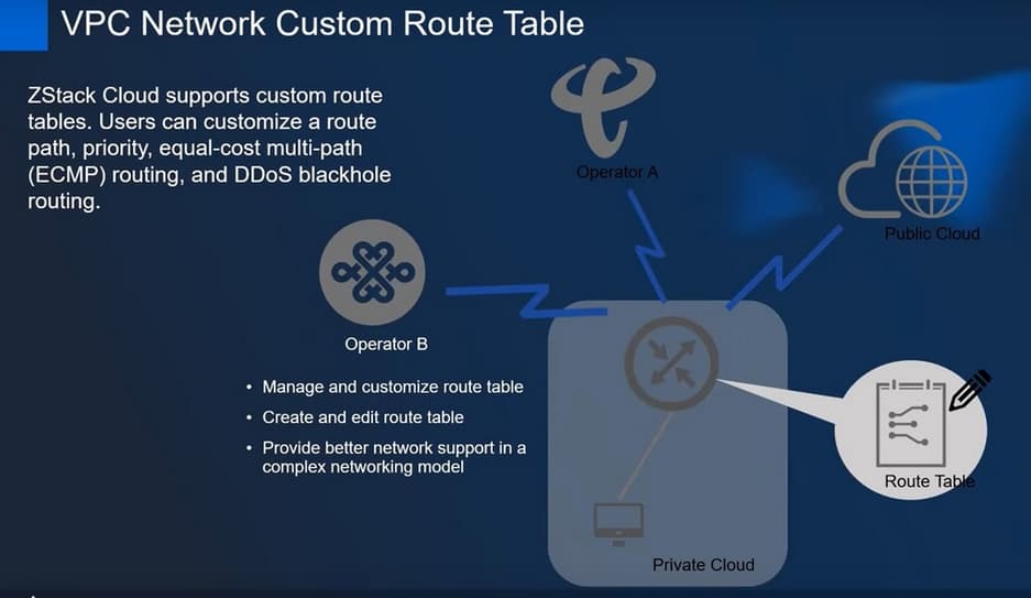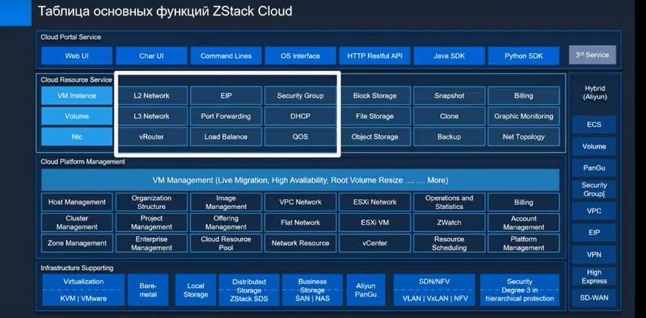 На этом слайде представлена таблица основных функций ZStack Cloud. Здесь представлен основной стек технологий, отдельно выделен стек сетевой виртуализации.