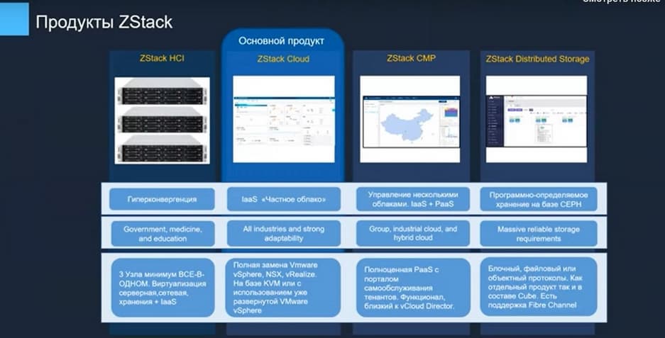 Что касается дополнительных функциональных возможностей, то ZStack HCI – это гиперконвергентная платформа, ZStack CMP – это надстройка над ZStack Cloud с возможностью управлять большой инфраструктурой. И технология ZStack Distributed Storage позволяет на базе x86 серверов строить программно-определяемые продукты.