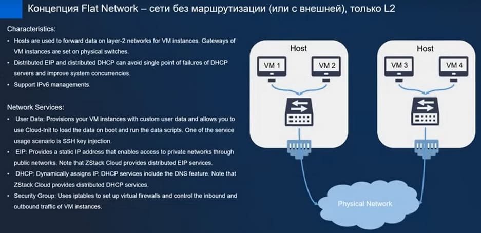 Что касается непосредственно сетевых составляющих, то есть Flat Network, Public Network, Management Network, System Network. Самая базовая сеть – это Flat Network, внутренняя виртуальная сеть (сети без маршрутизации или с внешней маршрутизацией), только L2. Такую сеть проще использовать, когда вы настраиваете всю виртуализацию на физическом уровне. Концепция Flat Network изображена на следующем слайде.
