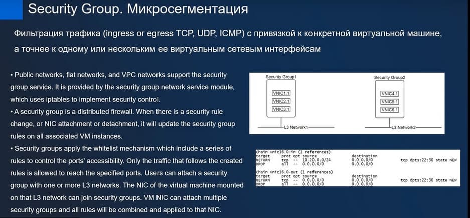 Что касается Security Group – это достаточно распространенная технология, которая позволяет создавать трафик основных протоколов, которые можно привязывать к конкретным группам или к виртуальным машинам.