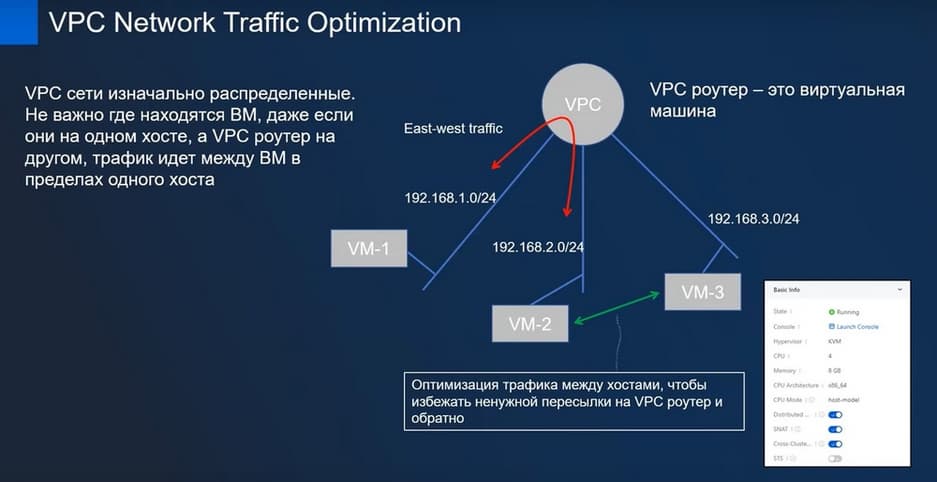 VPC сети изначально распределенные. Не важно где находится ВМ, даже если они находятся на одном хосте, а VPC роутер на другом, трафик идет между ВМ в пределах одного хоста. VPC Network Traffic Optimization осуществляет оптимизацию трафика между хостами, чтобы избежать ненужной пересылки на VPC роутер и обратно.
